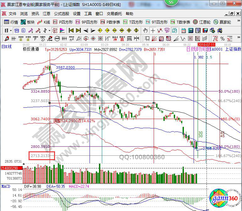 ☆依據贏家江恩理論系統波段百分比延伸線提示:日線跌穿180度2800點,按照規則看低一線至240度2713附近。