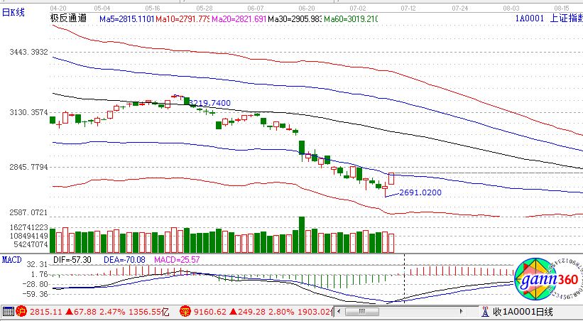 滬指漲2.47%,報2815點;深成指漲2.80%,報9160點;創業板指漲2.64%,報1581點。盤面上看,草甘膦、醫藥商業、可燃冰、水泥、鈦白粉、石墨電極、化工新材料、次新股等板塊漲幅居前。滬股通凈流入25億,深股通凈流入11億。相應的極反通道指標的支撐壓力提示,如下圖所示: