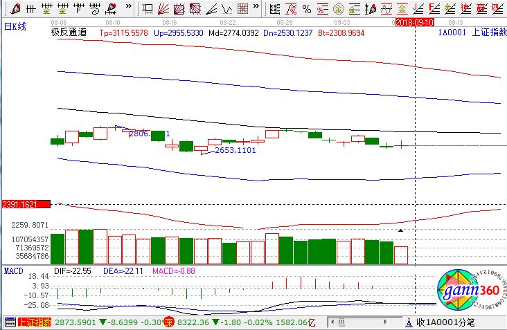 截至收盤,滬指漲0.40%,報收2702點;深成指跌0.02%,報收8322點;創業板漲0.17%,報收1425點。從盤面上看,黃金、煤炭、機場航運、醫藥電商、鈦白粉、水泥等板塊漲幅居前;電子發票、國產軟件、芯片、網絡安全、5G、集成電路等板塊跌幅居前。滬股通凈流出500萬,深股通凈流出1.2億。相應的極反通道指標的支撐壓力提示,如下圖所示: