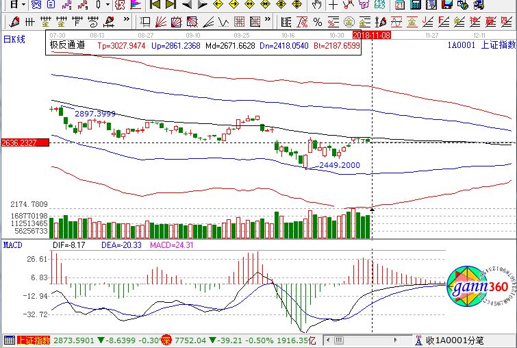 滬指跌0.68%,報收2641點;深成指跌0.50%,報收7752點;創業板跌0.25%,報收1345點。從盤面上看,黃金、ST板塊、5G、殼資源、紡織制造、生物制品等板塊領漲;自由貿易港、證券、碳纖維、在線旅游、西安自貿區等板塊領跌。滬股通凈流入18億,深股通凈流入4.7億。相應的極反通道指標的支撐壓力提示,如下圖所示: