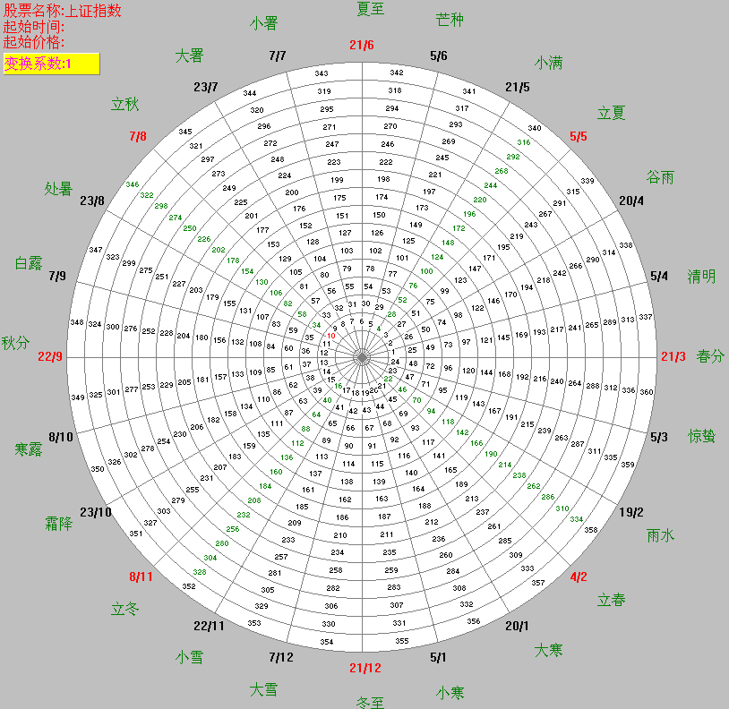如果股價或指數較大或較小不能在360數的輪中輪顯示,則可以選擇適當的變換系數,將股價或指數進行變換使其對應輪上的一個數字,這個數字是用紅色表示的。