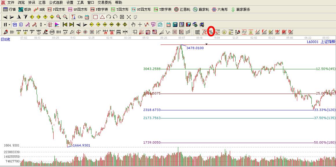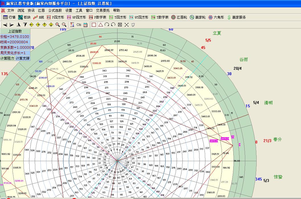 然后我們用江恩價格百分比在大盤2009-08-04日3478.01點作圖計算支撐位置。用心的朋友不難發(fā)現(xiàn)其重要的秘密,那就是他們都有45度【12.5%】90度【25%】120度【33.33】180度【50%】那么他們的點位是如何計算出來的呢?這些點位都跟3478.01點都有這重要行的關系;45度位置如何計算出來的呢?