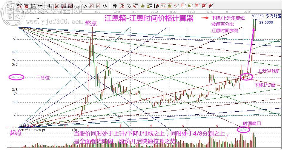 圖形解析:東方財富,以2012年12月7日低點和2015年6月5日高點為起始波段,時間周期為121周,根據市場具體的走勢,步長設定為121*6=726周,得出如上的分析圖。可以看到市場價格在周期內的波動情況,其中最關鍵的角度線的1*1線都是重要的阻力和支撐點,以及價格的4/8分割位,而當股價同時站上了兩條角度線的1*1線和價格的4/8分割位,就意味著市場趨勢非常強勢。因而,當股價突破了這幾個關鍵的位置后,4/8分割時間序列窗口開啟主升。