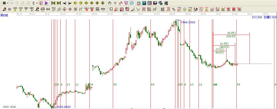 白糖1309合約7978下跌至5150以來后經(jīng)行了為期55周的下跌。55是斐波那契數(shù)列中的一個數(shù)字,而在其2012-09-28低點5150是其33周的下跌,僅僅誤差了1周。如果以2012-09-28低點5150為起點,那么高點在其2013-03-11周提前一周,然后開啟了一個調(diào)整。目前也走過了21時間窗口。下一個時間窗口在其34時間周期。2702如果用心去研究你會發(fā)現(xiàn)更為奇異的事情,白糖1309合約周線2008-12-13日低點2928點到期7948高點來調(diào)整的時間144周剛好坐落于周2012-09-28低點5150白糖1309合約周線時間窗口變盤在即,日線級別也非常的巧妙:白糖1309至2012-09-26日低點2150以來,每一次的低點都在不斷的抬高上方在其5480構(gòu)成了較為重要的壓力位置。