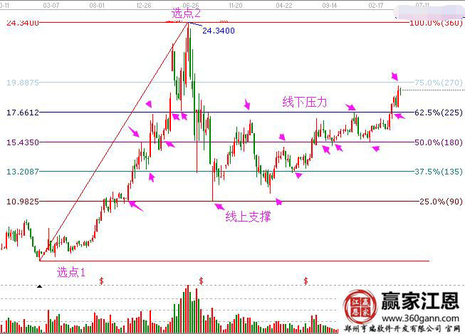 我們以上述股票為例,江恩波段百分比需要作圖:選取一個(gè)高點(diǎn)和低點(diǎn)作圖。這個(gè)高點(diǎn)和低點(diǎn)是歷史上的低點(diǎn)和高點(diǎn),對(duì)于后市的具有分析的點(diǎn)位。圖中選取了這波到達(dá)24.34位置的開始的低點(diǎn),以這波行情最高點(diǎn)24.34位置作為第二選點(diǎn)。畫法很簡單,選中軟件圖標(biāo)中的圖標(biāo),點(diǎn)擊凹陷,表示選中;接下來鼠標(biāo)放到低點(diǎn)下方,按住鍵盤上的shift鍵(可以精準(zhǔn)定位低點(diǎn)位置),定位后松開此鍵,右手按住鼠標(biāo)左鍵不松開,拖動(dòng)到高點(diǎn)(此時(shí)也要像低點(diǎn)一樣精準(zhǔn)對(duì)準(zhǔn)高點(diǎn))選好點(diǎn)好松開鼠標(biāo)就可以完成上面的作圖。這個(gè)工具的用法一樣是線上支撐,線下阻力。可以看到圖中高點(diǎn)和低點(diǎn)都出現(xiàn)分割線上。