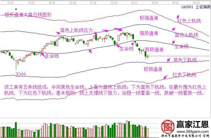 對(duì)于極反通道的學(xué)習(xí),先從工具的名稱和原理開始。名稱為極反通道,原理為物極必反。關(guān)于五條線和四個(gè)通道的名稱我在圖中已經(jīng)都標(biāo)出來了,大家對(duì)照記住就可以。剩下來就是最重要的用法了。極反通道是軟件中根據(jù)江恩分割比例為了使用編寫出來的趨勢(shì)工具,是軟件中最簡單使用最高的分析工具。無論是判斷大盤還是個(gè)股趨勢(shì)和買賣點(diǎn)都有重要的分析作用。其中生命線為趨勢(shì)強(qiáng)弱的分界點(diǎn),在生命線上為強(qiáng)勢(shì),可以放心操作;在生命線下為弱勢(shì),輕倉操作。
