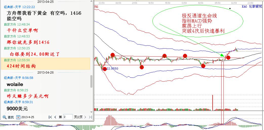 白銀在小時周期內【A】見底后第一波強勢反彈【1】高點后震蕩下跌至【B】點再次展開了【2】的一個上行,這里前期【1】位子壓力促使黃金再度下跌,運行后在次【3】觸及【2】附近高點快速下跌,在其前期【B】點附近止跌上行構成了3點。隨著行情的演繹就構成了4次突破的一個潛在因素,當天站穩極反通道,指標MACD黃白線也上0軸預示著行情的來臨,在重要的時間位置以訊而不及之勢4次突破后快速上行至極反通道藍色上軌,實現了快速暴利。