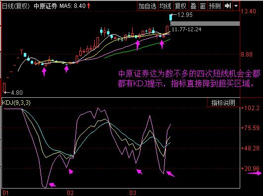 今天我們來說一下中原證券,這個股是最近比較熱的次新股,可以說是比較活躍的股票,那么用KDJ很合適。首先我們先看中原證券的KDJ圖形。從下圖中我們不難發(fā)現(xiàn)這些機(jī)會全部都有出現(xiàn)提示機(jī)會。