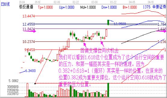 接下來我們看后市的兩次短線機(jī)會,江恩理論總結(jié)成一句話:研究歷史預(yù)測未來。我們從這前兩次的運(yùn)行發(fā)現(xiàn),黃金分割比例在這股票的運(yùn)行中發(fā)揮了比較重要的作用,那么后市呢?從下圖中我們不難發(fā)現(xiàn)另外一個重要的位置那就是0.618位置成為重要的壓力位置;還有就是后市的兩次KDJ敏感指標(biāo)異動的時候都是處于價格支撐位置,從形態(tài)上講是處于箱體的底部,這些都說明了這是買入的位置。