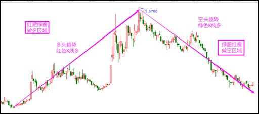 紅——紅色陽K線,綠——綠色陰K線,“紅肥綠瘦”即紅色K線多,綠色K線少,代表多頭強勢,處于此階段的個股為做多區域,可以積極參與;反之,則為做空區域。那么,在確定一個股票是否要買入時,最直觀的看到紅色K線數大于綠色K線數,則可以重點關注。