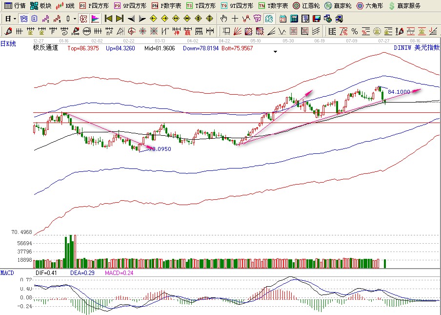 第一次破趨勢線:在2012.年6月5日,破后6月7日進行了一個回抽,而這個高點剛好打到趨勢線的壓力位置,形成了一個絕佳的賣點,美元指數在2012年5月5日,一根陰線破掉了極反通道上軌,按照極反通道買賣法則來看回踩極反通道上軌不破就是最佳的空單位置,上圖可以清楚的看的清楚,極反通道上軌位置2次受制壓力最終跌至極反通道生命線附近位置,美元指數現在呢?連續3天的陰線實體破掉了趨勢線,目前在生命線附近,符合預期,如果趨勢線回踩不能有效上攻那么美元指數將下跌持續,極反通道生命線這個時候是第3次了,前2次回落極反通道生命線都有一波上攻的趨勢,但是這次不一樣,他的環境不一樣。