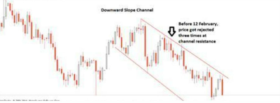 如果單獨的講解理論知識不方便大家的記憶,今天我們就通過美元瑞郎的實戰案例來進行相關的介紹。首先我們在日K線圖上繪制處趨勢線,顯示處該貨幣對下跌趨勢。通道進一步顯示,當時價格在通道阻力方面遭遇到了三次強壓制,如下圖所示。